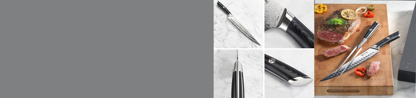 Gefertigt aus 67-lagigem X-7 Damaststahl und präzise von Hand geschärft, bieten die Full-Tang-Klingen außergewöhnliche Schärfe, Balance und Langlebigkeit. Die schwarzen, ergonomischen G-10 Fiberglasgriffe liegen sicher in der Hand und unterstreichen das edle, dunkle Design der Serie.